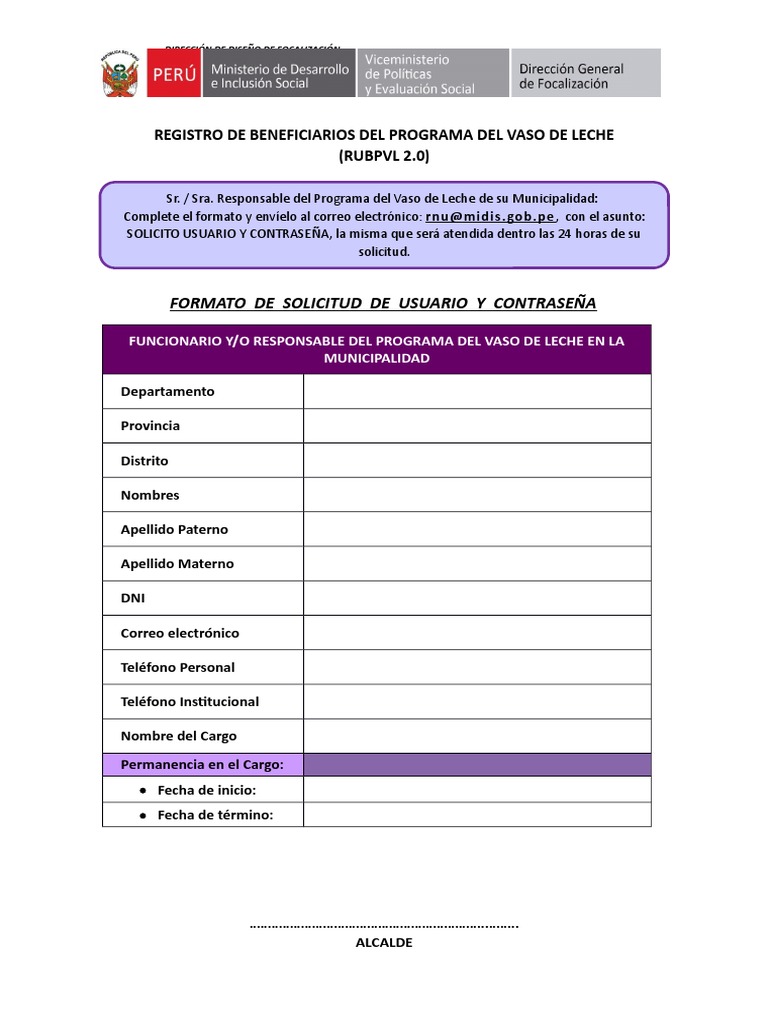 Complete el formato y envíelo al correo electrónico : rnu@midis. gob.pe , con el asunto: