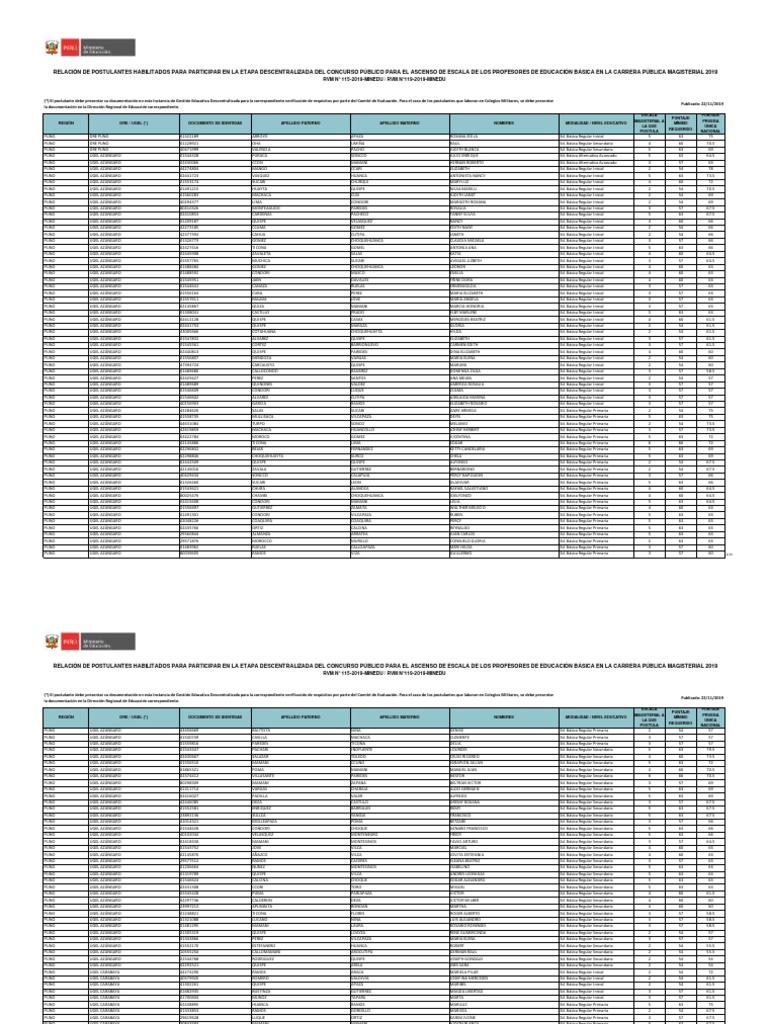RELACIÓN DE POSTULANTES HABILITADOS PARA PARTICIPAR EN LA ETAPA DESCENTRALIZADA DEL CONCURSO PÚBLICO PARA EL ASCENSO DE ESCALA DE LOS PROFESORES DE EDUCACIÓN BÁSICA EN LA CARRERA PÚBLICA MAGISTERIAL 2019