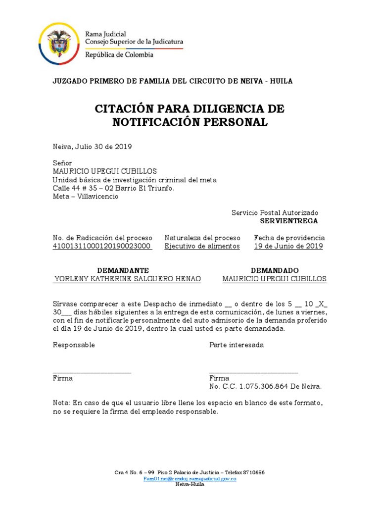 con el fin de notificarle personalmente del auto admisorio de la demanda proferido