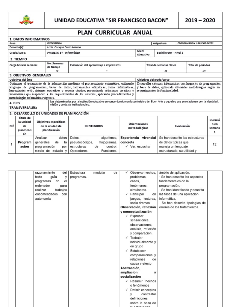 UNIDAD EDUCATIVA "SIR FRANCISCO BACON" 2019 – 2020