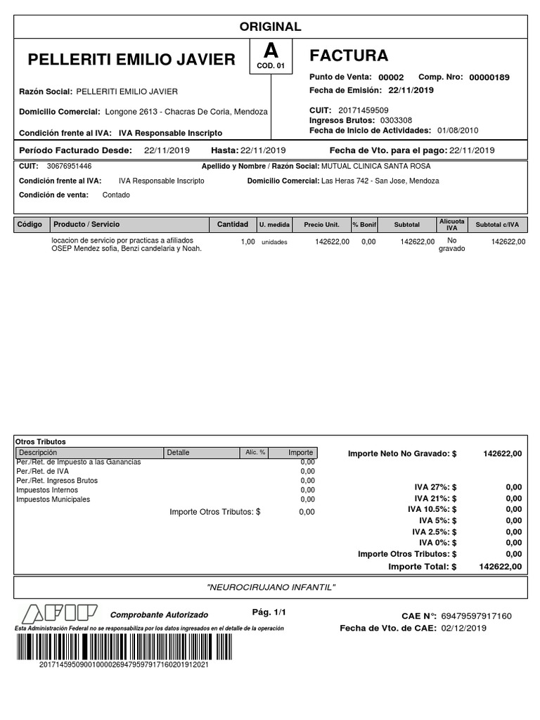 Razón Social: PELLERITI EMILIO JAVIER Fecha de Emisión: 22/11/2019