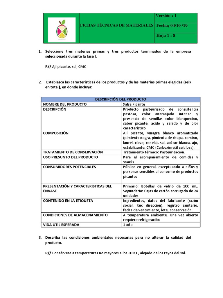 2. Establezca las características de los productos y de las materias primas elegidas (seis