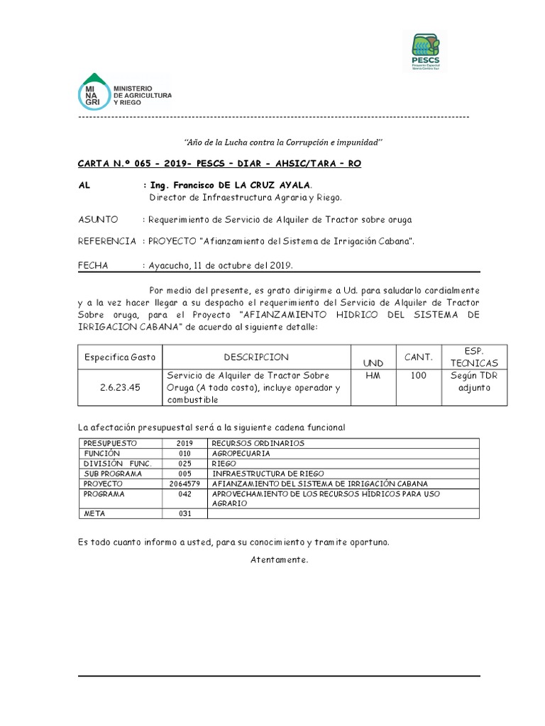 CARTA N.º 065 - 2019- PESCS – DIAR - AHSIC/TARA – RO