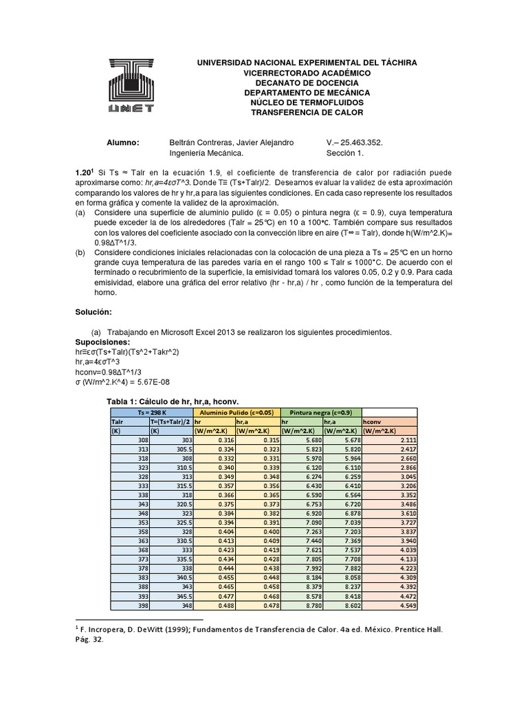 emisividad, elabore una gráfica del error relativo (hr - hr,a) / hr , como función de la temperatura del