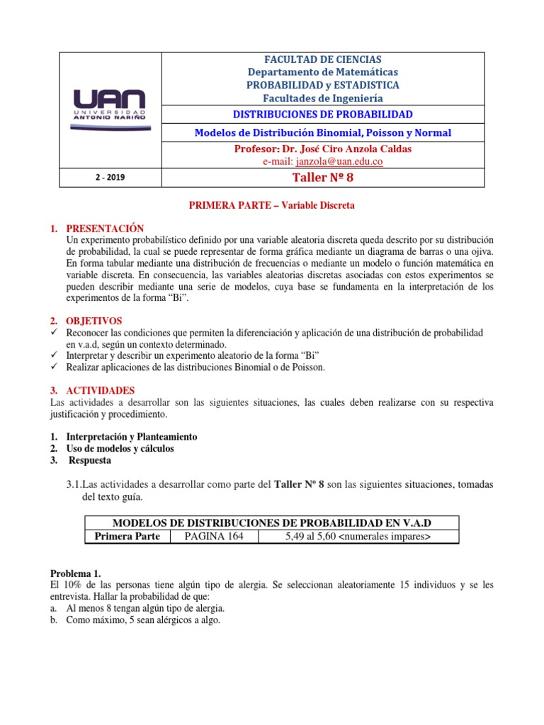 Taller No. 8: Modelos de Distribuciones de Probabilidad v.a.d. y v.a.c. - UAN