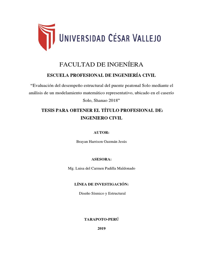 Título: “Evaluación del desempeño estructural del puente peatonal solo mediante el análisis de un modelamiento matemático representativo,