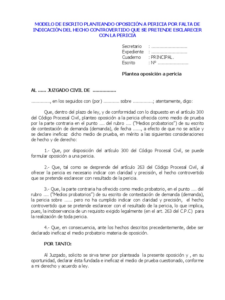 MODELO DE ESCRITO PLANTEANDO OPOSICIÓN A PERICIA POR FALTA DE