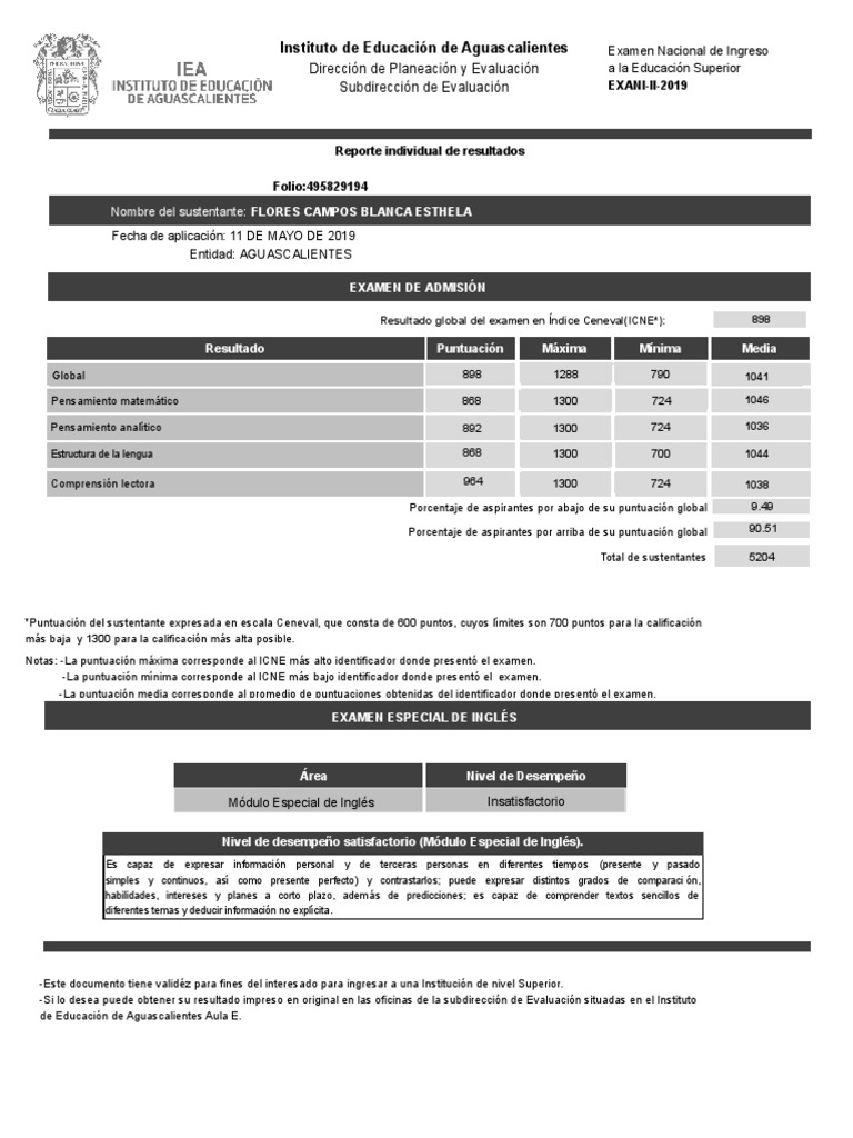 Notas: -La puntuación máxima corresponde al ICNE más alto identificador donde presentó el examen.