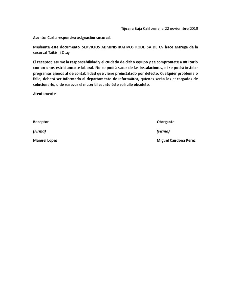 Asunto: Carta responsiva asignación sucursal.