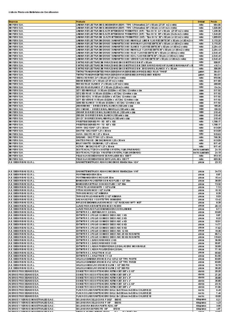 Lista de Precios de Materiales de Construccion