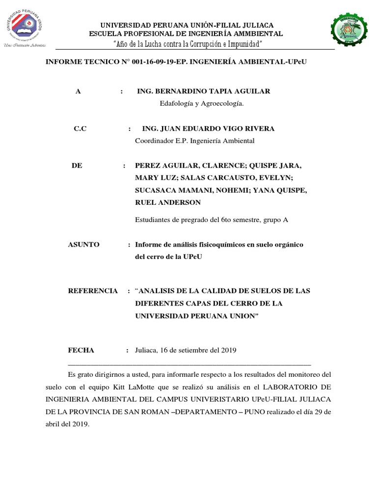 INFORME TECNICO N° 001-16-09-19-EP. INGENIERÍA AMBIENTAL-UPeU