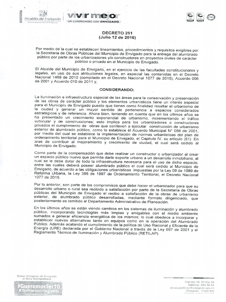 alumbrado público del Municipio de Envigado, dirigido principalmente a los urbanizadores