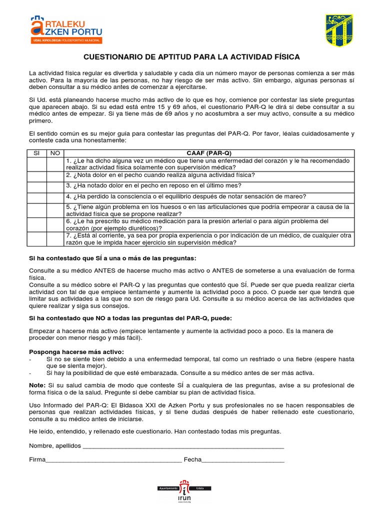 Uso Informado del PAR-Q: El Bidasoa XXI de Azken Portu y sus profesionales no se hacen responsables de