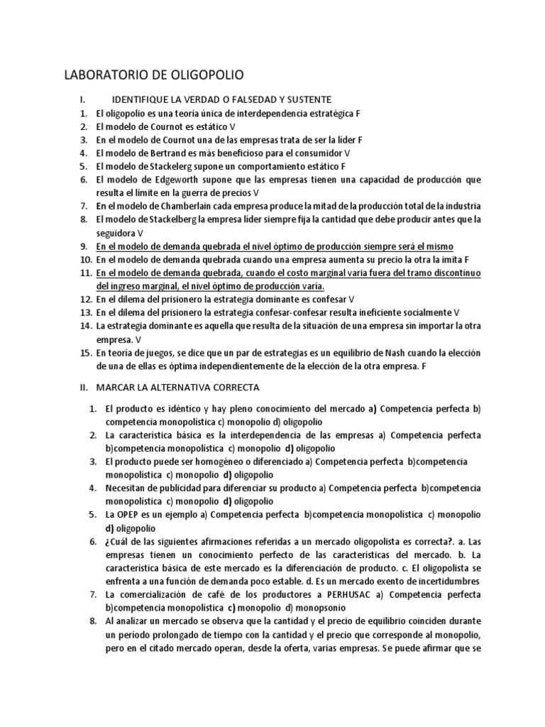 1. El oligopolio es una teoría única de interdependencia estratégica F