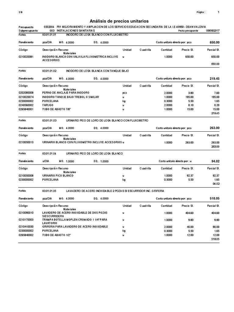 Rendimiento u/DIA MO. 1.0000 EQ. 1.0000 Costo unitario directo por : u 271.78
