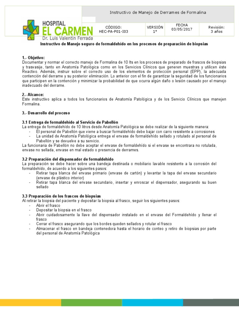 Instructivo de Manejo seguro de formaldehído en los procesos de preparación de biopsias