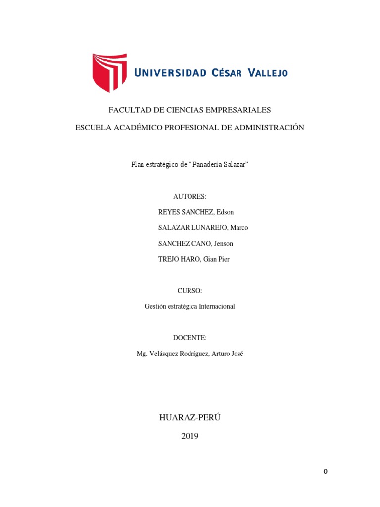 El presente Plan Estratégico de Panadería Salazar del ha sido elaborado para el curso de