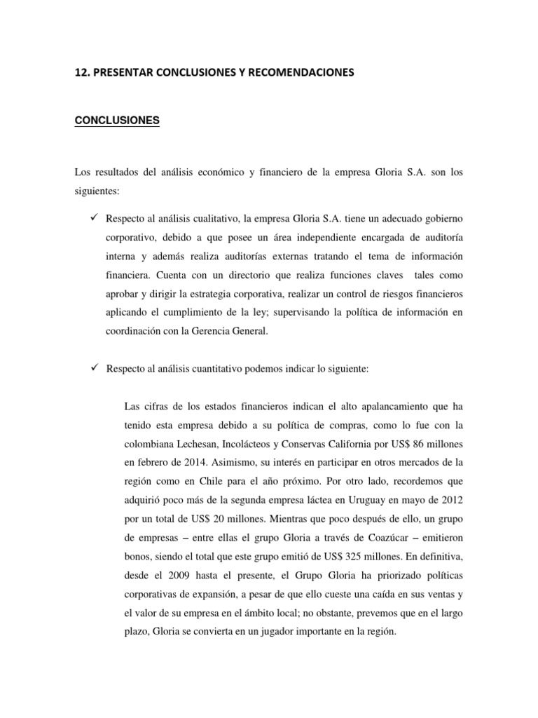 Los resultados del análisis económico y financiero de la empresa Gloria S.A. son los