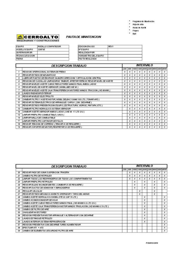 13 CAMBIAR FILTRO HIDRAULICO SISTEMA VIBRADOR X X X X X X X X