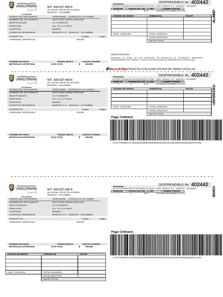 CÓDIGO DEL ESTUDIANTE 70020182283 CURRÍCULO: con créditos CODIGO DE BANCO CHEQUE No. VALOR