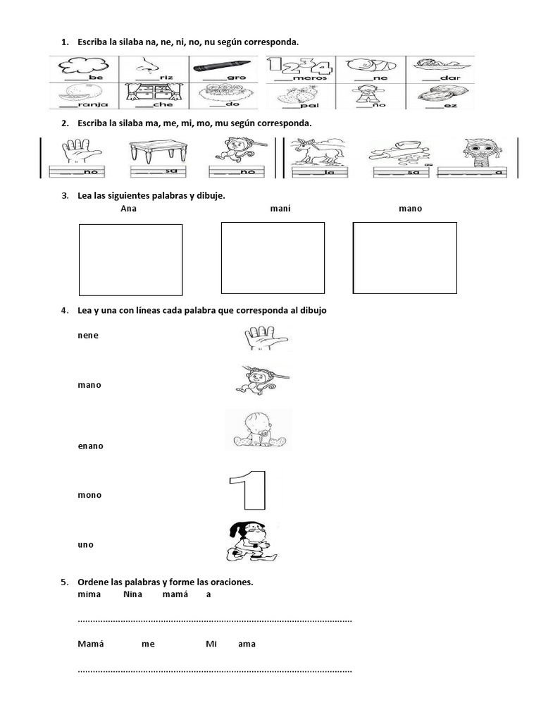 1. Escriba la silaba na, ne, ni, no, nu según corresponda.