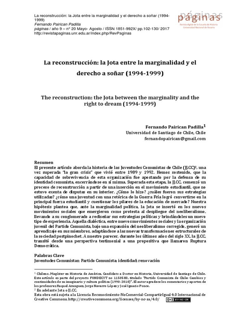 Este artículo es parte del proyecto FONDECYT no 1150583, titulado “Partido Comunista de Chile: Cambios y