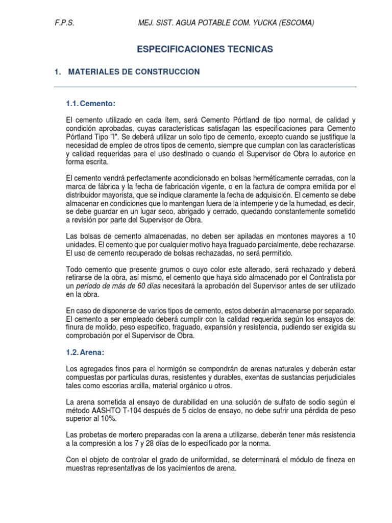 El cemento será del tipo portland, fresco y de calidad probada. el agua deberá ser limpia, no