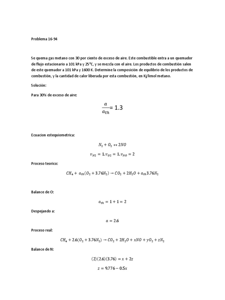 𝐶𝐻4 + 2.6(𝑂2 + 3.76𝑁2 ) → 𝐶𝑂2 + 2𝐻2 𝑂 + 0.0121𝑁𝑂 + 0.594𝑂2 + 9.77𝑁2