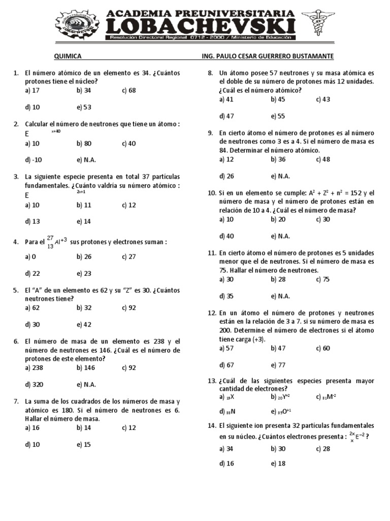 1. El número atómico de un elemento es 34. ¿Cuántos 8. Un átomo posee 57 neutrones y su masa atómica es