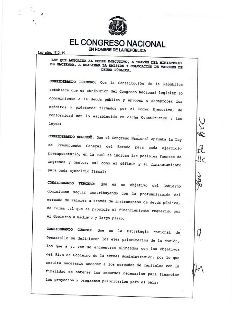 Presidente Danilo Medina promulga la Ley 512-19 que autoriza al Poder Ejecutivo, a través del Ministerio de Hacienda, a realizar la emisión y colocación de valores de deuda pública.