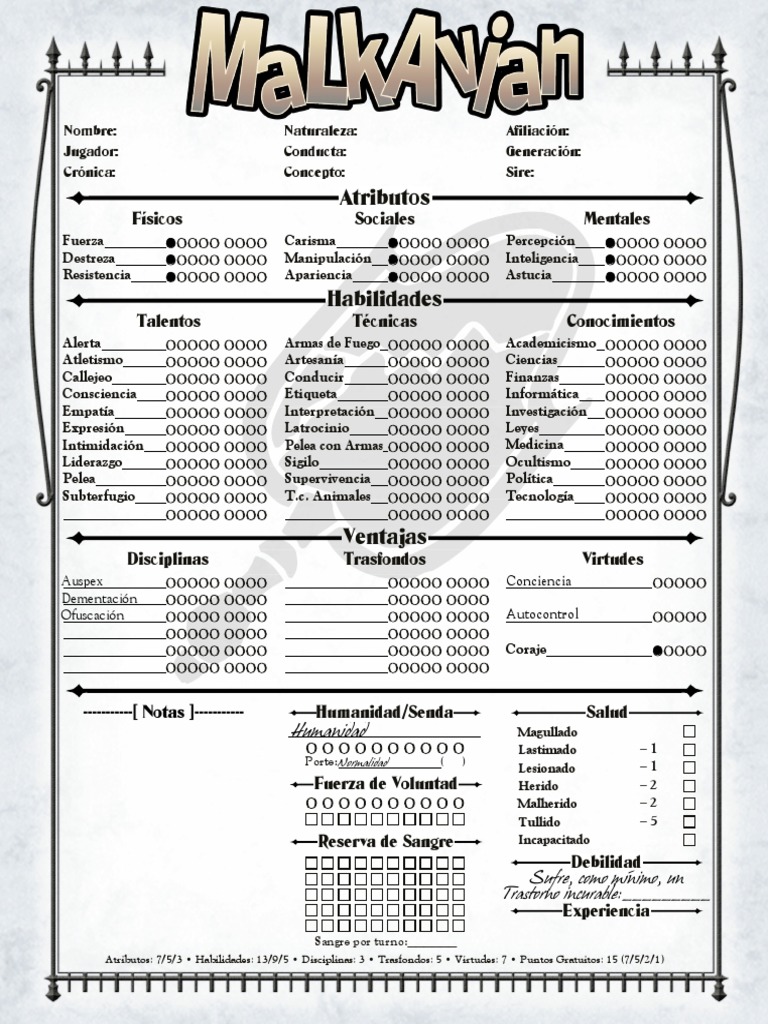 Atributos: 7/5/3 • Habilidades: 13/9/5 • Disciplinas: 3 • Trasfondos: 5 • Virtudes: 7 • Puntos Gratuitos: 15 (7/5/2/1)