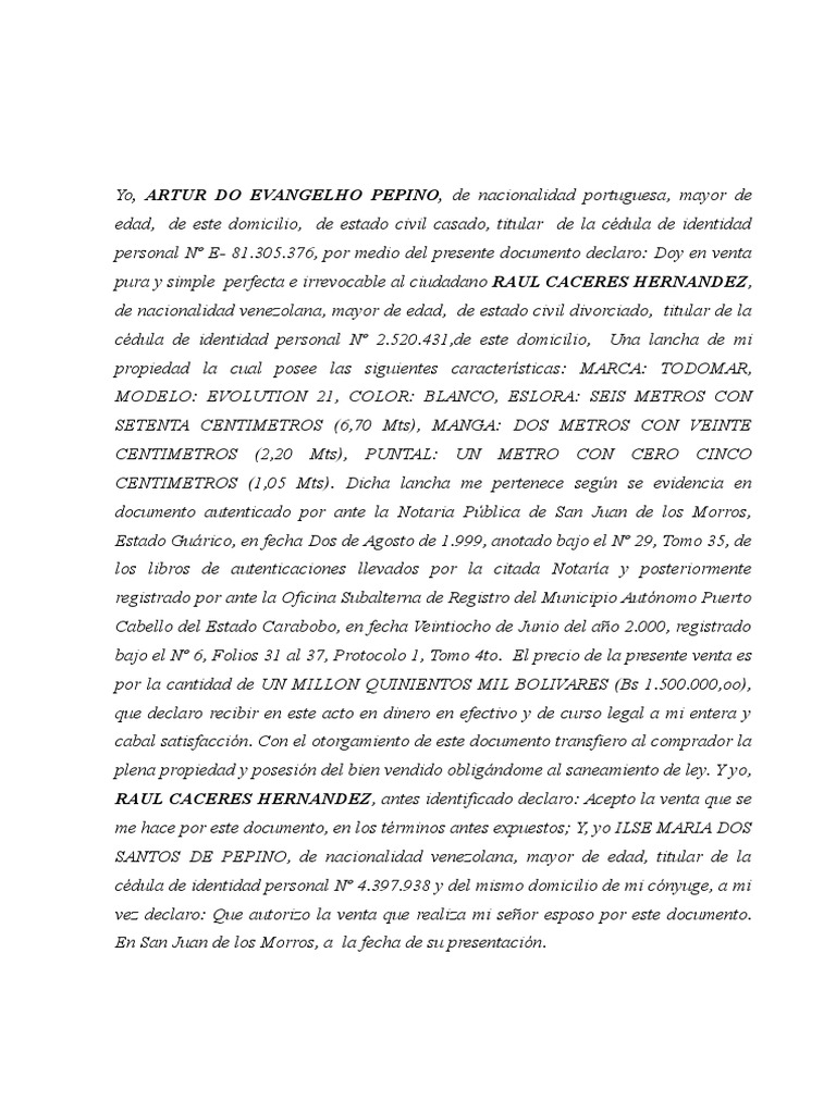 V-7.295.710, por medio del presente documento declaro: Doy en venta pura y simple