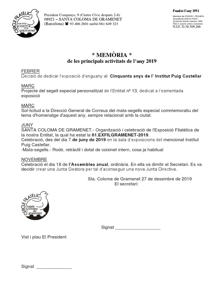 la nostra Entitat, la qual ha estat la [Link]-2019.