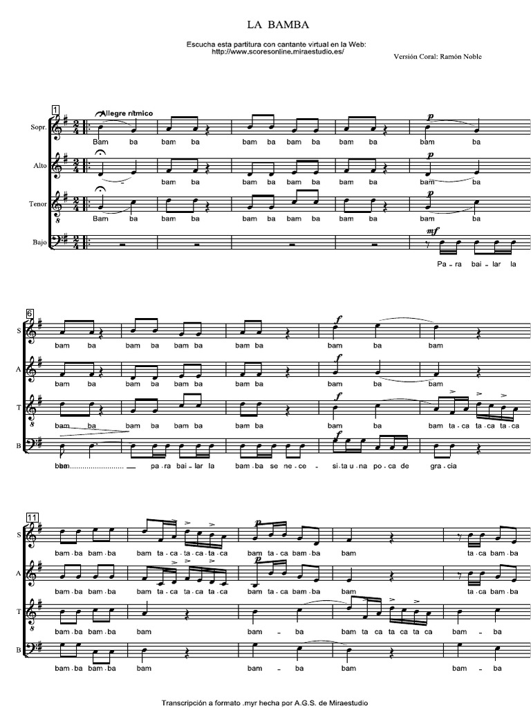 El documento presenta una partitura musical titulada 'La Bamba' con las partes para soprano, alto, tenor y bajo. La partitura contiene la letra musical repetida con la frase 'bam ba bam ba' en cada parte.