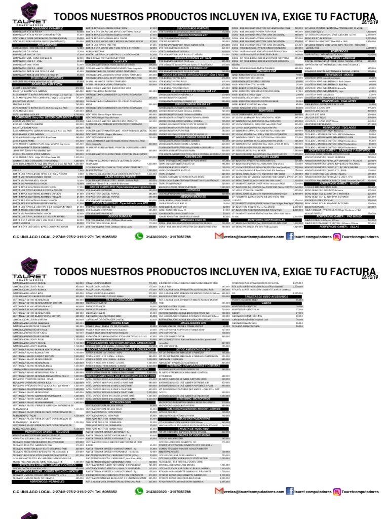 Z390: AORUS MASTER: 64gb 3M2 3PCI-Exp Cross SLI RGB 1,399,000 TEMPLADO 1,350,000 500W: COOLER MASTER ELITE V3 185,000 27" ASUS Ref.VP278QG Res.1920x1080 75Hz 2hdmi 779,000 KINGSTON HYPERX CLOUD ALPHA ROJO PS4,XBOX 299,000