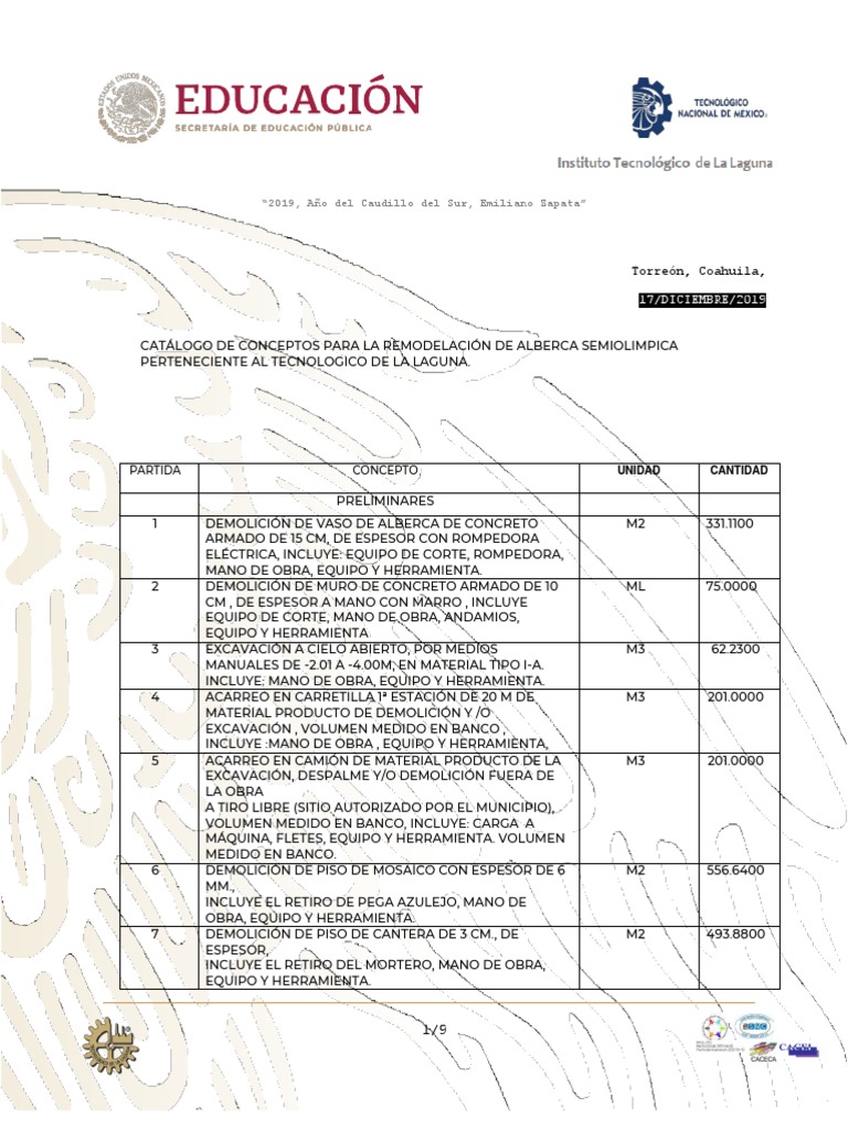 CATÁLOGO DE CONCEPTOS PARA LA REMODELACIÓN DE ALBERCA SEMIOLIMPICA