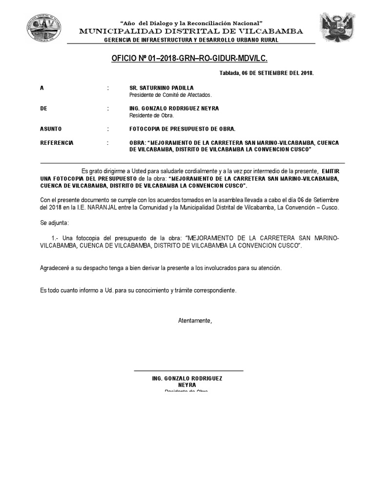 OFICIO Nº 01–2018-GRN–RO-GIDUR-MDV/LC.