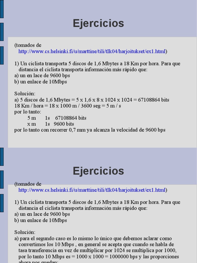 1) Un ciclista transporta 5 discos de 1,6 Mbytes a 18 Km por hora. Para que