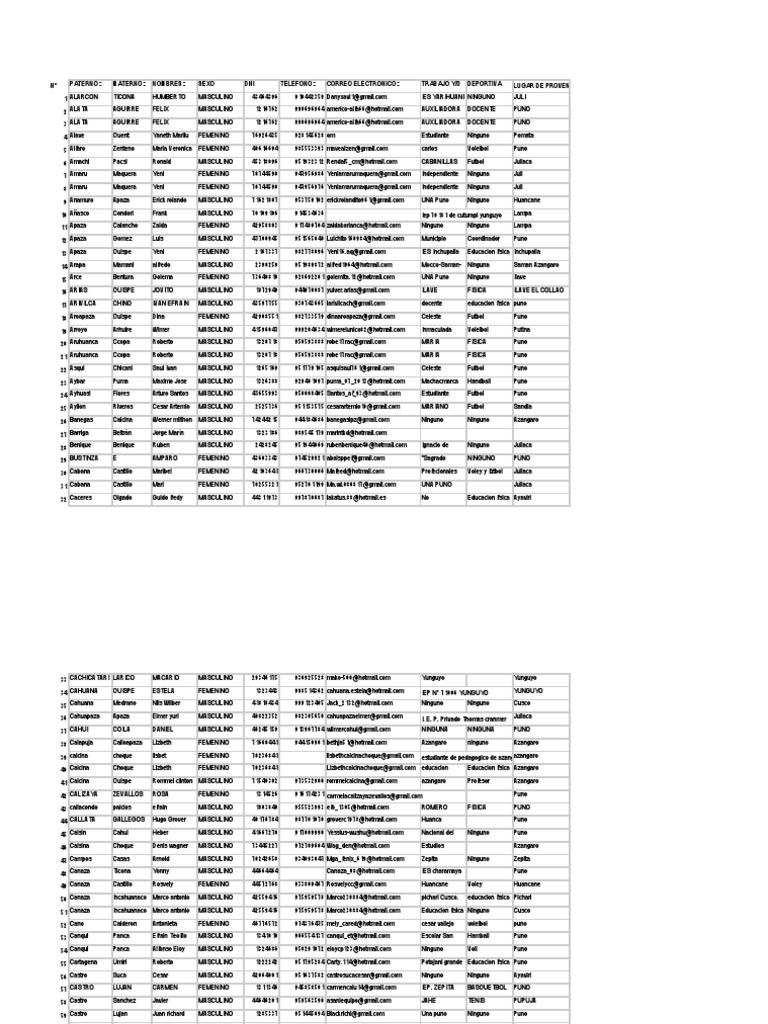 30 Cabana Castillo Maribel FEMENINO 42103641 966730006 Mafeed@[Link] Profecionales Voley y futbol Juliaca