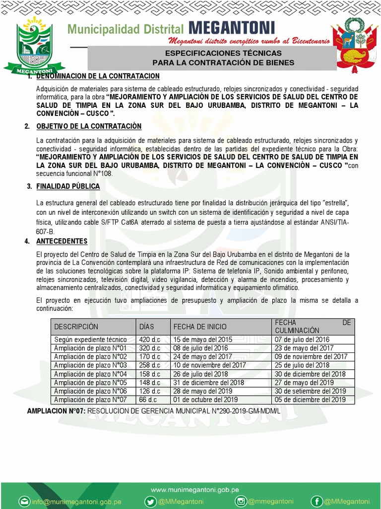 informática, para la obra “MEJORAMIENTO Y AMPLIACIÓN DE LOS SERVICIOS DE SALUD DEL CENTRO DE