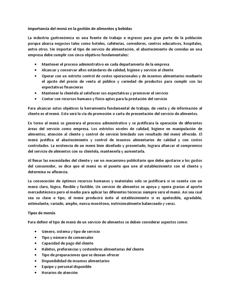 Importancia del menú en la gestión de alimentos y bebidas