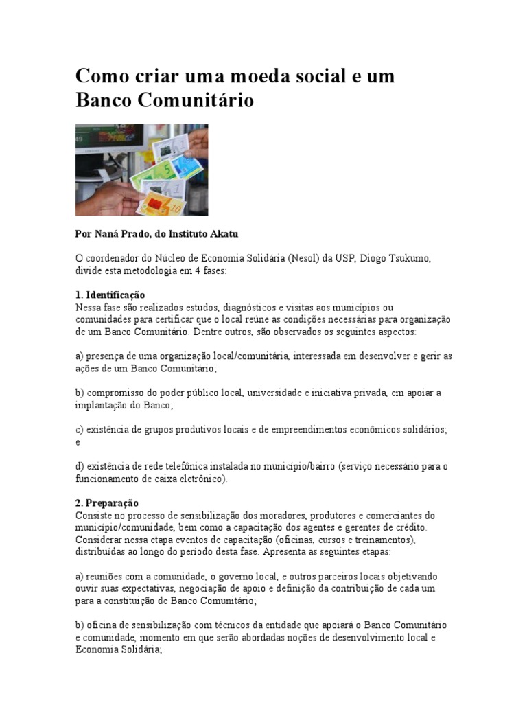 de um Banco Comunitário. Dentre outros, são observados os seguintes aspectos: