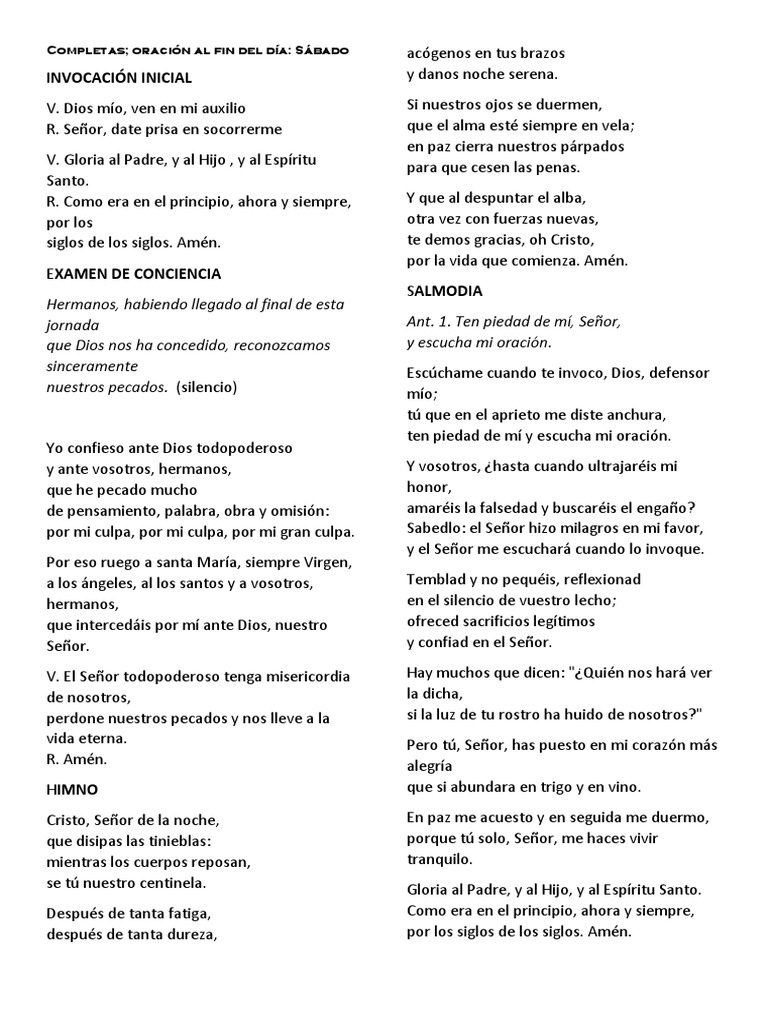Completas; oración al fin del día: Sábado acógenos en tus brazos