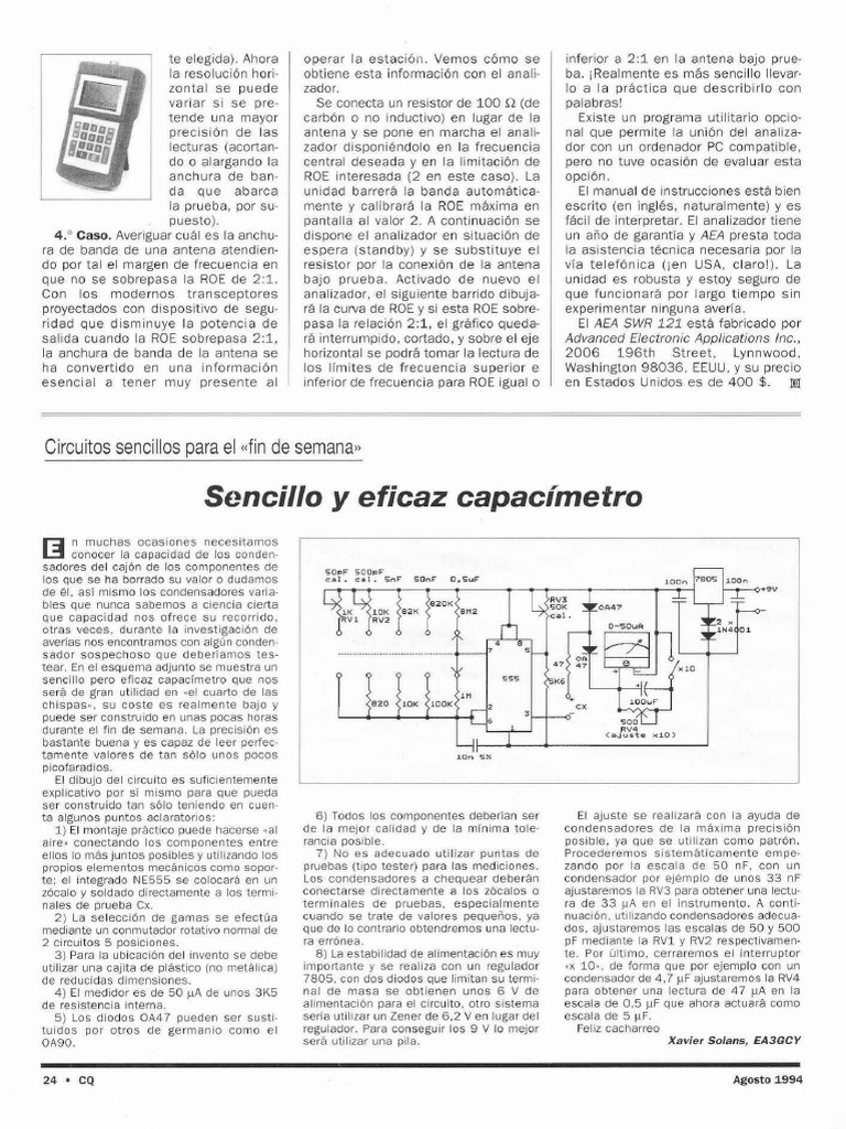Se refiere a la construcción sencilla de un medidor de capacidad para condensadores desde 50pf hasta 0.5uf, con explicación del montaje y su diagrama.