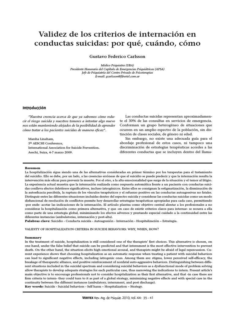 sión social y del temor al litigio, esas situaciones involu- ra la hospitalización, reduce el potencial suicida a corto