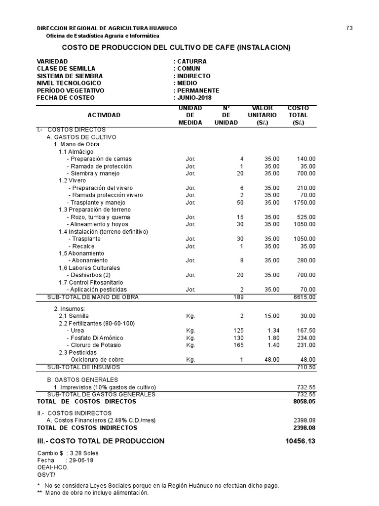 COSTO DE PRODUCCION DEL CULTIVO DE CAFE (INSTALACION)