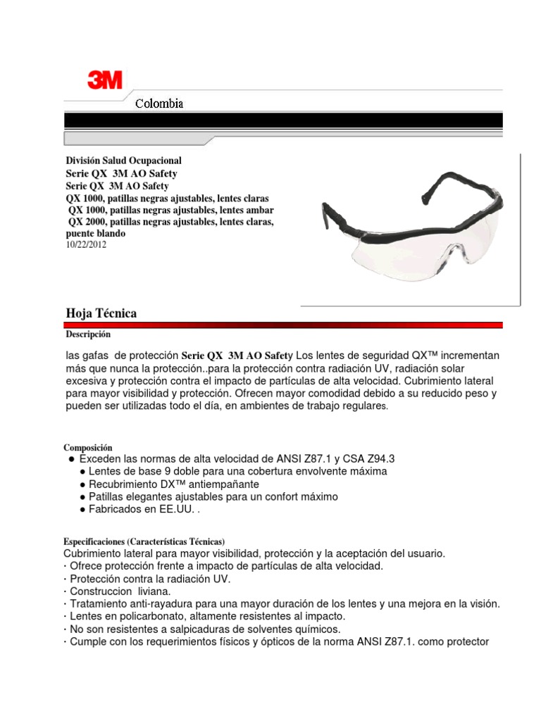 · Cumple con los requerimientos físicos y ópticos de la norma ANSI Z87.1. como protector