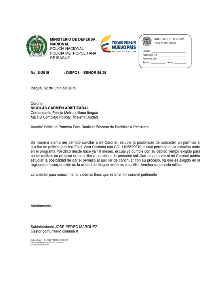 poder realizar su proceso de bachiller a patrullero, la presente solicitud es para ver si mi Coronel podría