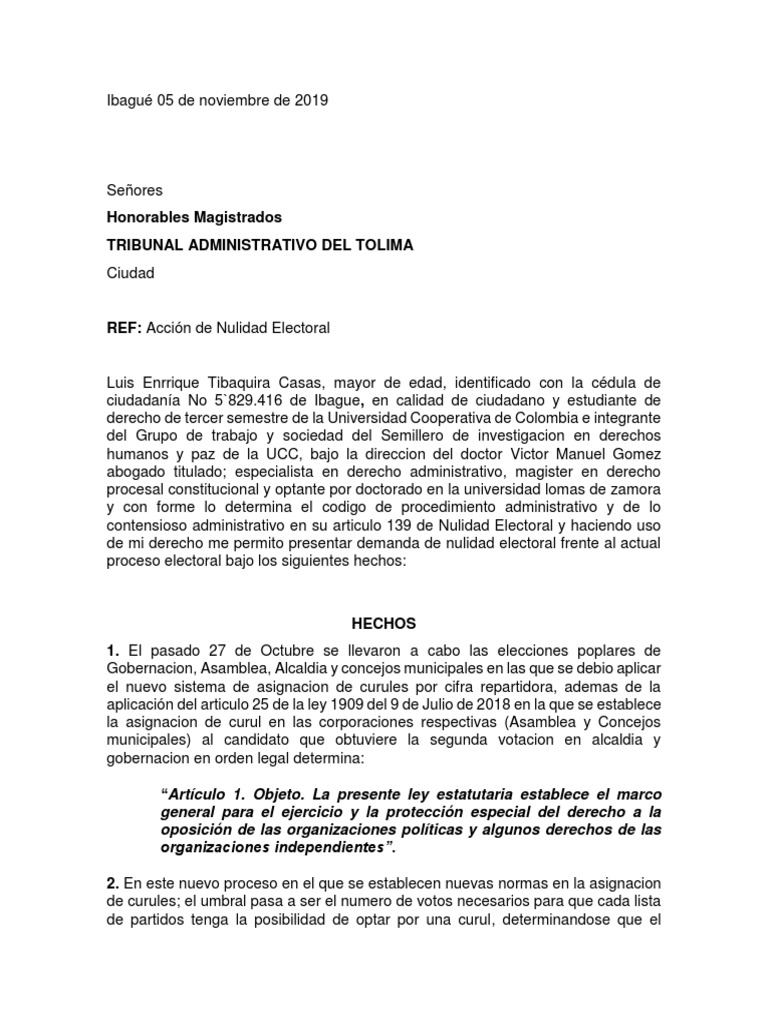 de mi derecho me permito presentar demanda de nulidad electoral frente al actual