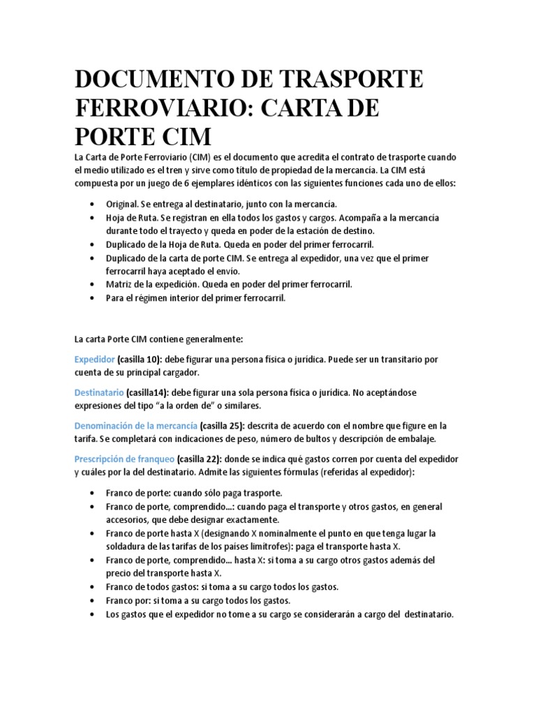 La carta Porte CIM contiene generalmente: